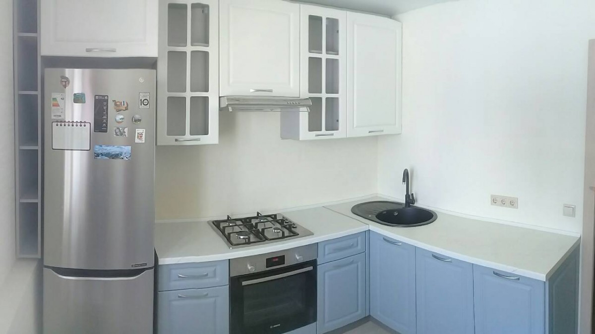 Фасады нижних модулей: МДФ, Голубая платина, Фрезеровка Квадро
