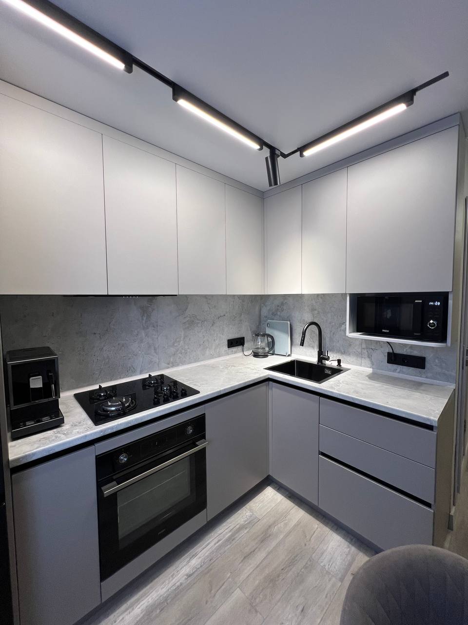 При размерах 2800 × 1600 мм нам удалось разместить все необходимое без ощущения перегруженности пространства. Газовую трубу аккуратно спрятали в нише с холодильником, сохранив доступ для проверки. Микроволновку вынесли в нишу ниже верхних шкафов — так мы не потеряли полезное место для хранения и сделали использование удобным для всей семьи.