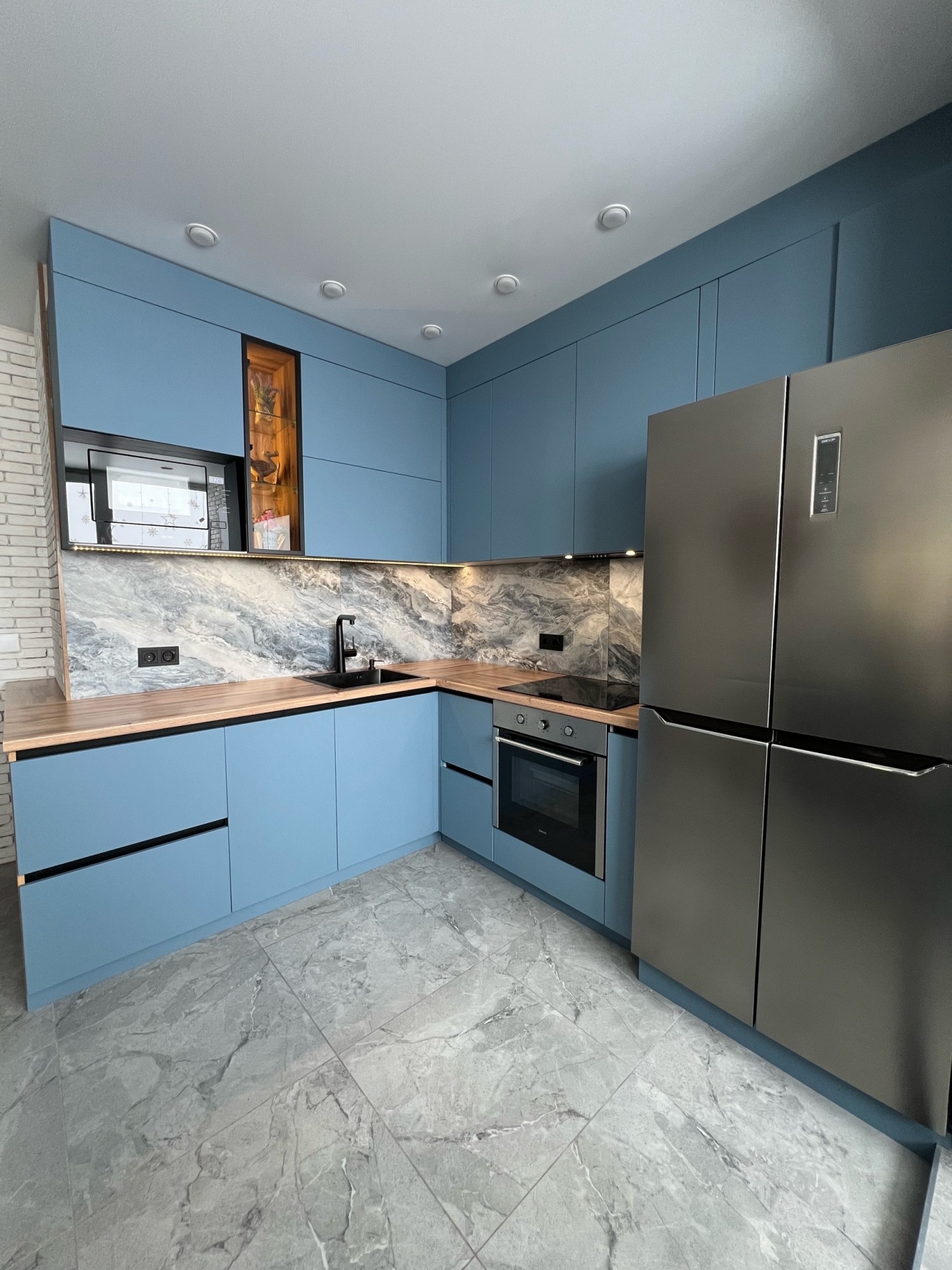 Все разложено по местам, отдельные полочки для хранения большого количества специй, выдвижные ящики, бутылочница, подъемный механизм Авентос Блюм для удобного использования сушкой. Шкаф с подсветкой с тонким алюминиевым профилем в черном цвете, украшает кухню, позволяет поставить красивый декор. Кухонный гарнитур плавно переходит в обеденную зону с ТВ в едином стиле.