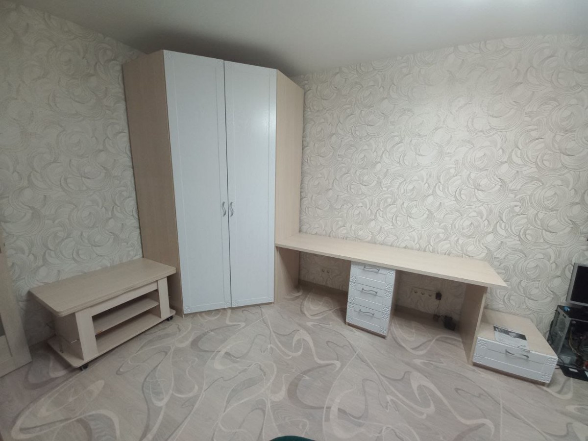 Рабочая зона с вместительным шкафом для одежды и журнальным столиком.