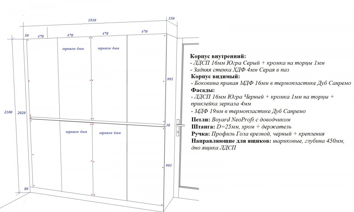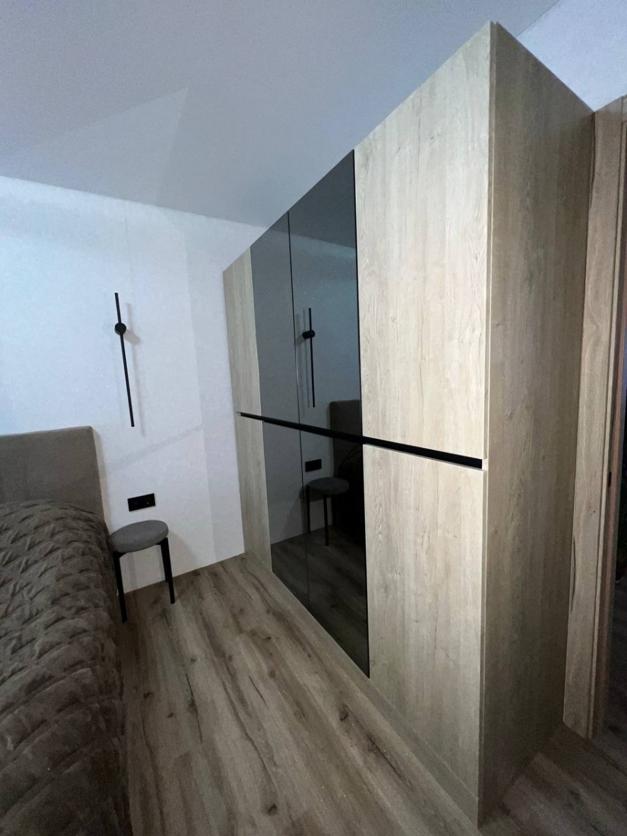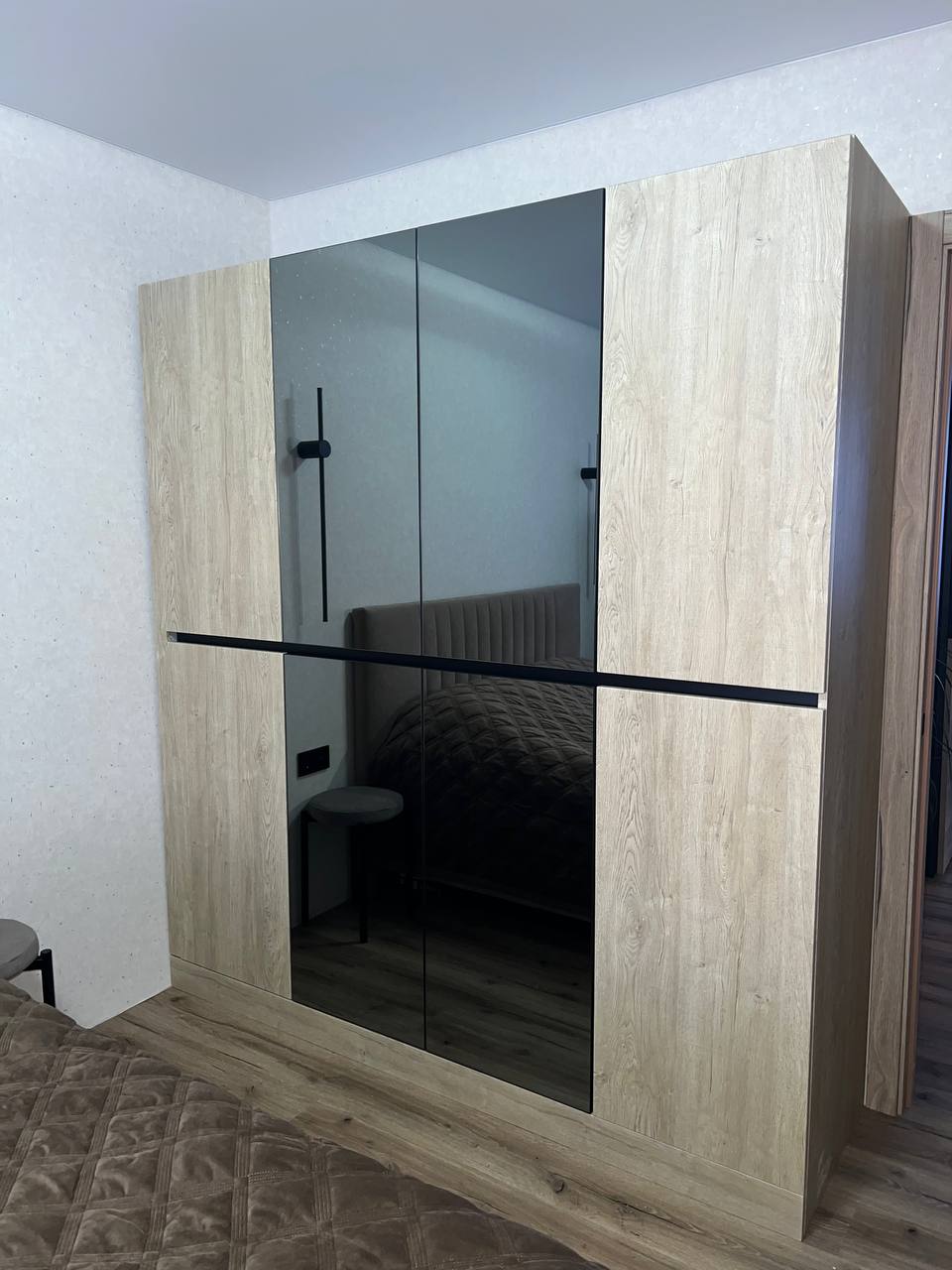 Шкаф с распашными дверями в спальню. Для открывания дверей установлен профиль GOLA в черном цвете. Зеркало графит в сочетании с древесными фасадами смотрится стильно и современно.